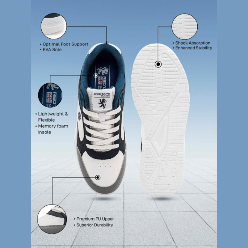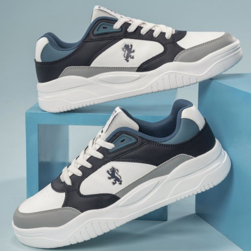 A pair of round toe grey & white sneakers ,has regular styling,